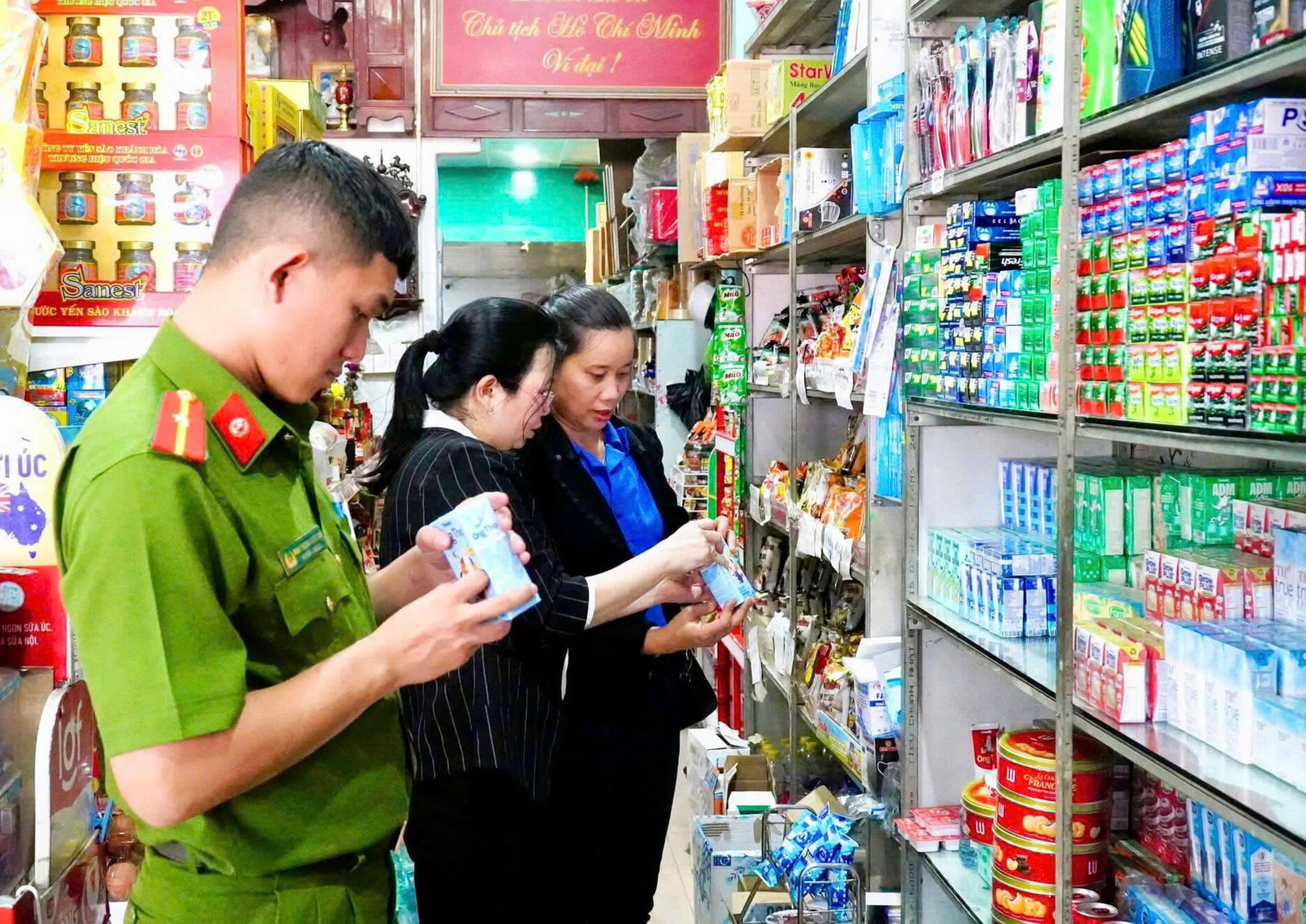 Đoàn kiểm tra liên ngành VSATTP phường Bình Long kiểm tra nguồn gốc xuất xứ hàng hóa, nhãn mác, hạn sử dụng tại một cơ sở kinh doanh trên địa bàn.