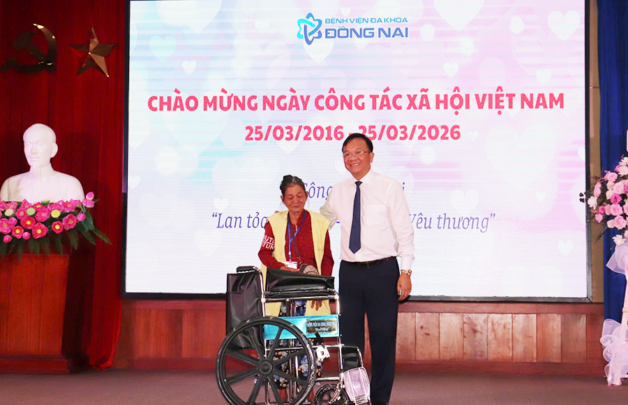 BS.CKII Ngô Đức Tuấn, Giám đốc Bệnh viện ĐK Đồng Nai tặng xe lăn cho bệnh nhân khó khăn đang điều trị tại bệnh viện.