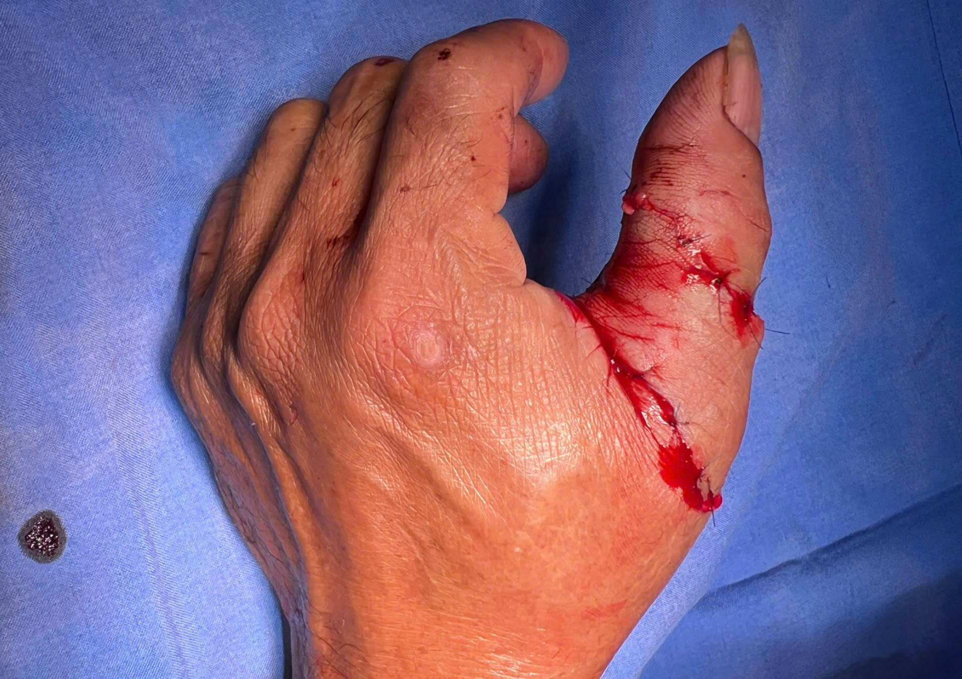 Trường hợp thứ nhất là ông L.H.L. (56 tuổi, ngụ phường Hố Nai) nhập viện ngày 10-2 trong tình trạng đứt lìa ngón cái tay trái do bị nồi bánh chưng đổ dập trúng. Dù phần đứt lìa được bảo quản đúng cách, nhưng vết thương tại mỏm cụt rất nham nhở, lóc da và lộ xương. Đáng chú ý, bệnh nhân có tiền sử đái tháo đường và tăng huyết áp, khiến nguy cơ biến chứng sau mổ rất cao.