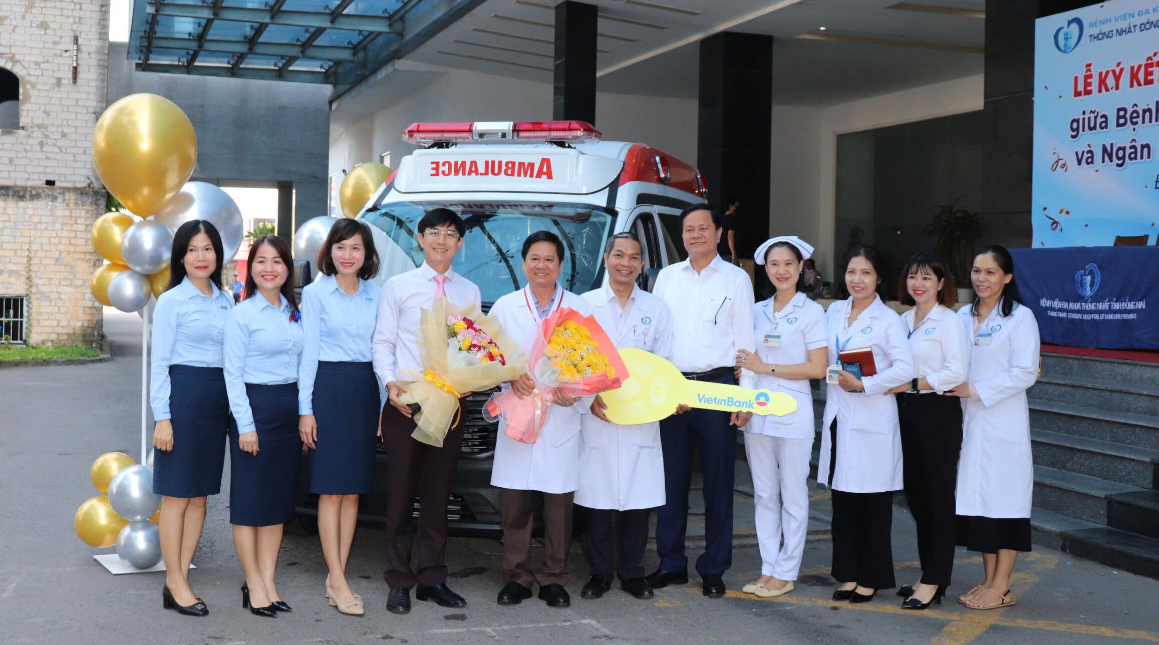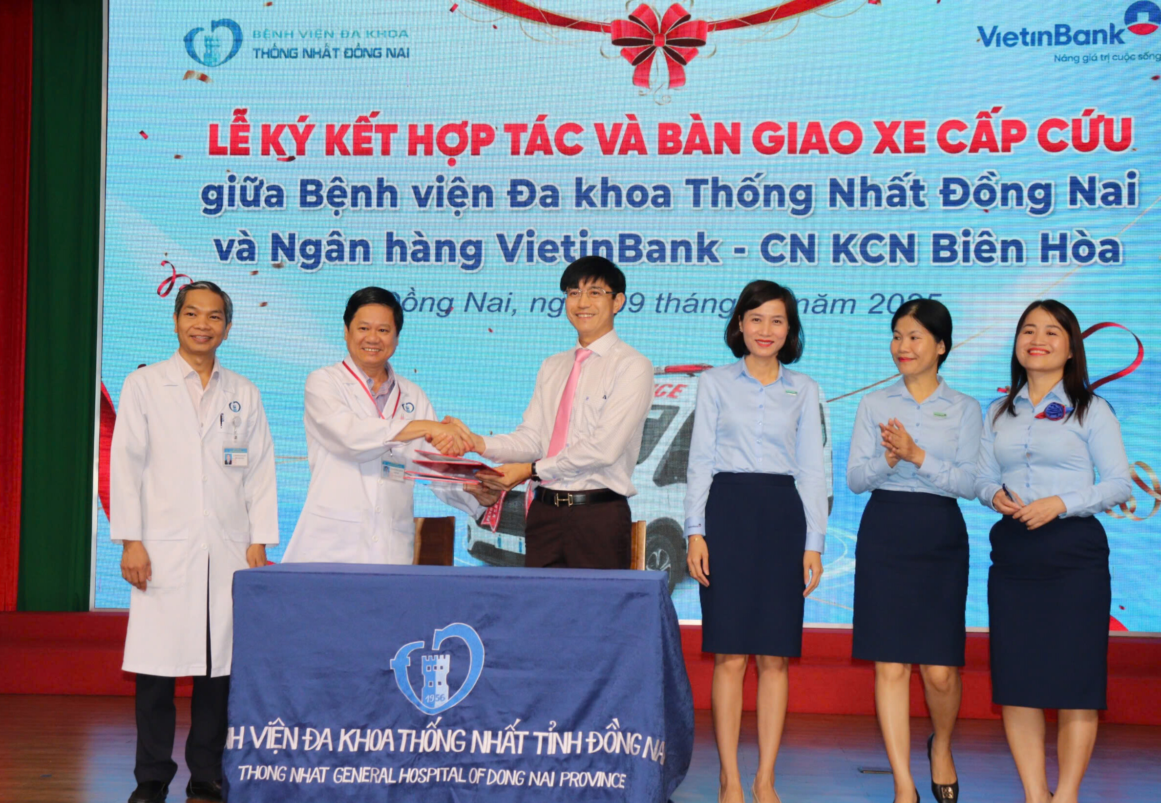 Sáng 9-12, Bệnh viện Đa khoa (ĐK) Thống Nhất Đồng Nai phối hợp với Ngân hàng VietinBank – Chi nhánh Khu công nghiệp Biên Hòa tổ chức lễ ký kết hợp tác và bàn giao xe cấp cứu trị giá gần 1,1 tỷ đồng. Tham dự buổi lễ có BS.CKII Nguyễn Văn Bình - Phó Giám đốc Sở Y tế; ông Nguyễn Đức Trịnh - Giám đốc VietinBank KCN Biên Hòa; BS.CKII Nguyễn Tường Quang - Giám đốc Bệnh viện ĐK Thống Nhất Đồng Nai cùng lãnh đạo, cán bộ của hai đơn vị.
