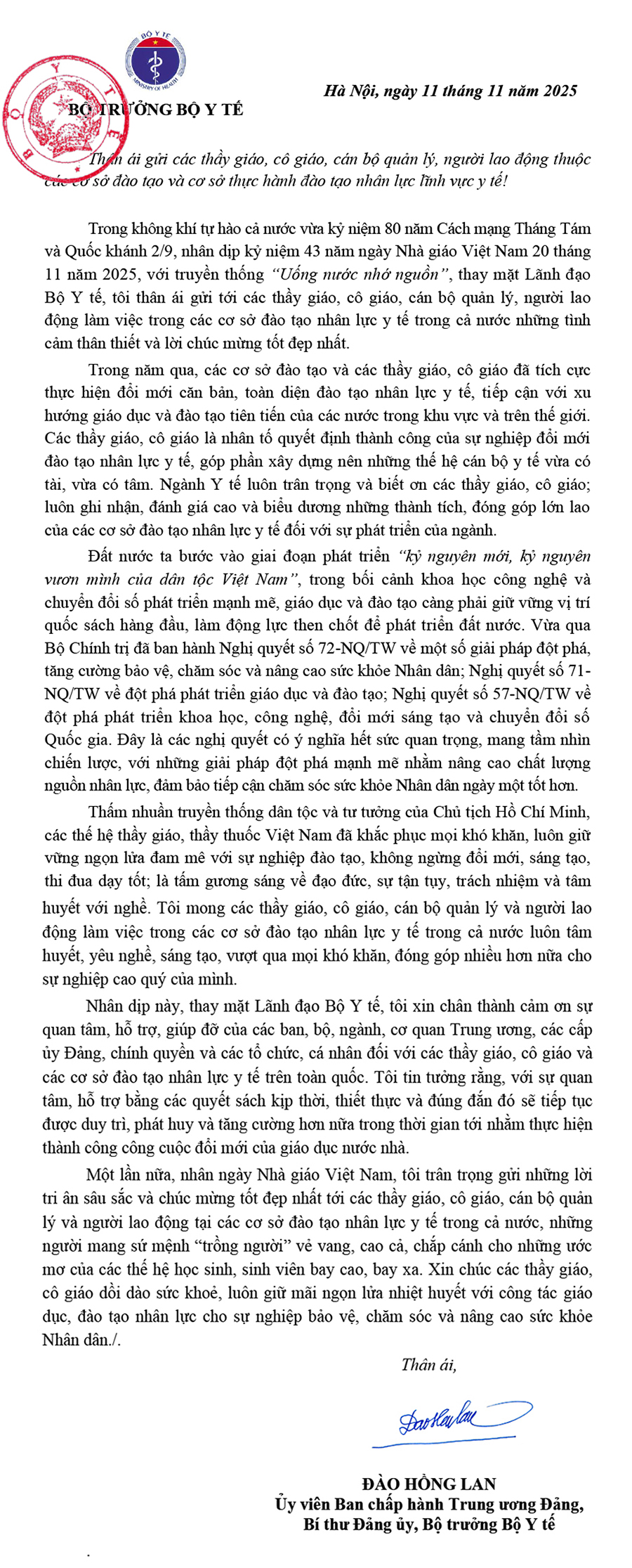 Nhân dịp kỷ niệm 43 năm ngày Nhà giáo Việt Nam 20 tháng 11 năm 2025, với truyền thống “Uống nước nhớ nguồn”, Bộ trưởng Đào Hồng Lan - thay mặt Lãnh đạo Bộ Y tế, gửi Thư chúc mừng tới các thầy giáo, cô giáo, cán bộ quản lý, người lao động làm việc trong các cơ sở đào tạo nhân lực y tế trong cả nước.
