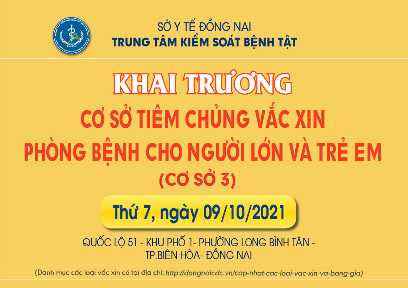 Ngày 9-10, CDC Đồng Nai đã tiến hành khai trương cơ sở tiêm chủng tại địa chỉ: Quốc Lộ 51 - Khu Phố 1- P.Long Bình Tân - TP.Biên Hòa - Đồng Nai, đây là cơ sở tiêm chủng số 3 của CDC Đồng Nai đi vào hoạt động (Địa chỉ Tại đây).