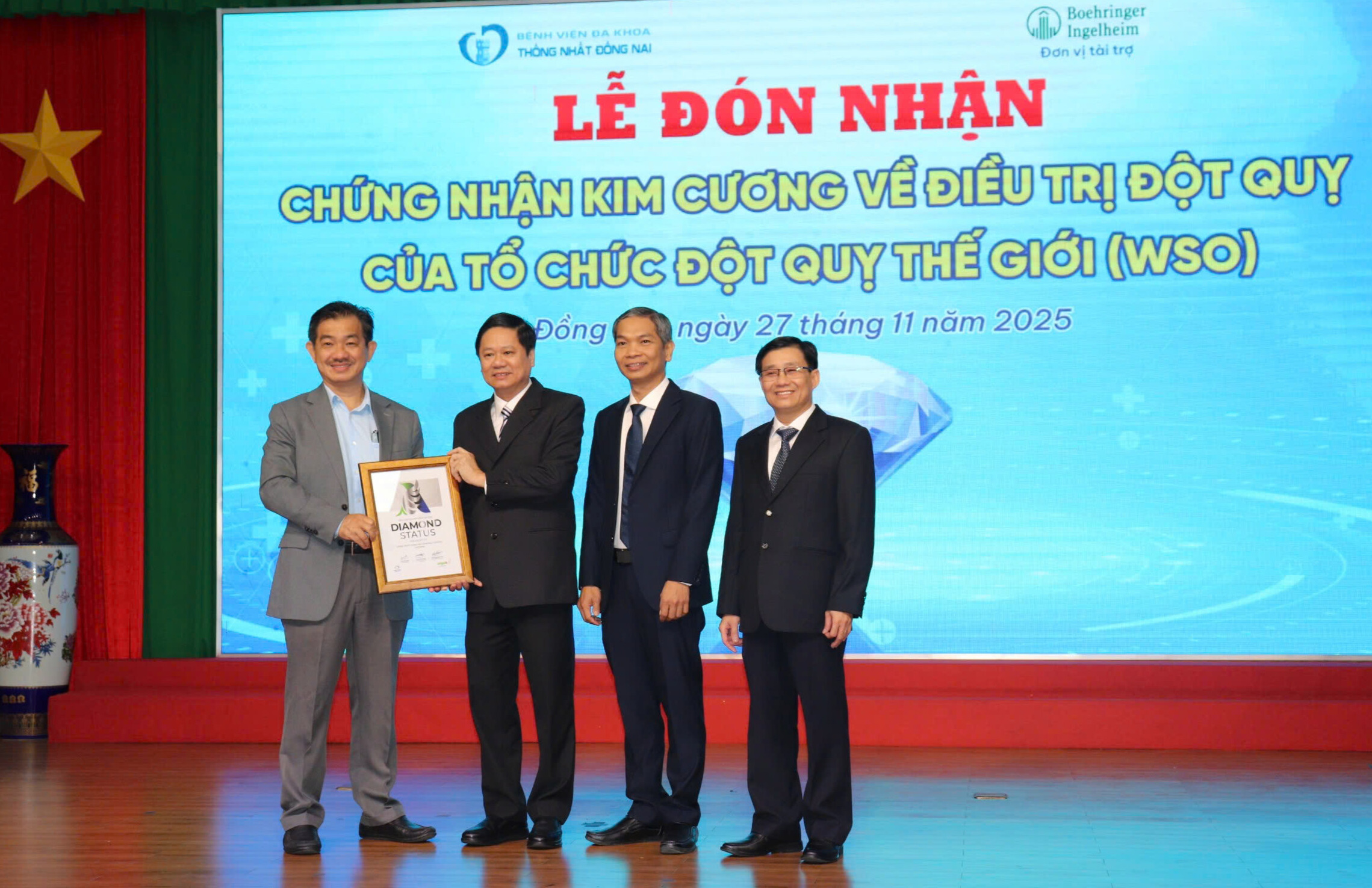 Chất lượng điều trị đột quỵ tại Đồng Nai ngày càng được nâng cao, từng bước đáp ứng các tiêu chuẩn quốc tế. (Trong ảnh: Lãnh đạo Bệnh viện ĐK Thống Nhất đón nhận chứng nhận Kim cương trong điều trị đột quỵ của Hội đột quỵ thế giới).