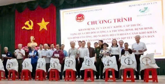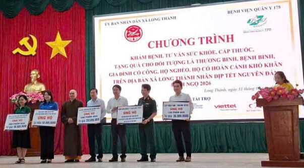 Sáng ngày 31/01, Ủy ban nhân dân xã Long Thành đã phối hợp với Bệnh viện Quân y 175 tổ chức chương trình khám bệnh, tư vấn sức khỏe, cấp thuốc miễn phí và tặng quà Tết cho 500 thương binh, bệnh binh, gia đình có công với cách mạng, hộ nghèo và hộ có hoàn cảnh khó khăn trên địa bàn xã, nhân dịp Tết Nguyên đán Bính Ngọ 2026.