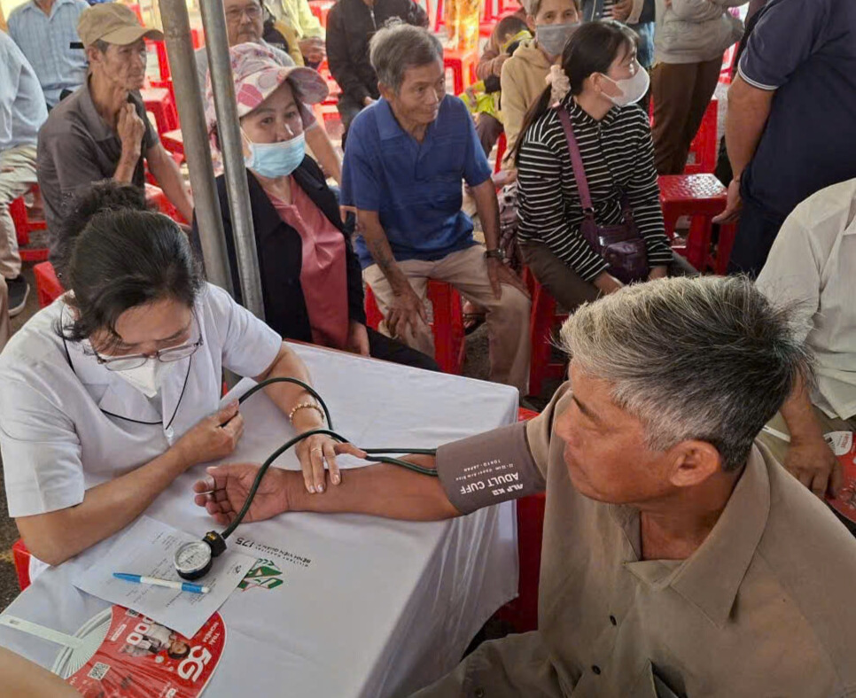 Người dân được nhân viên y tế đo huyết áp tại buổi khám bệnh