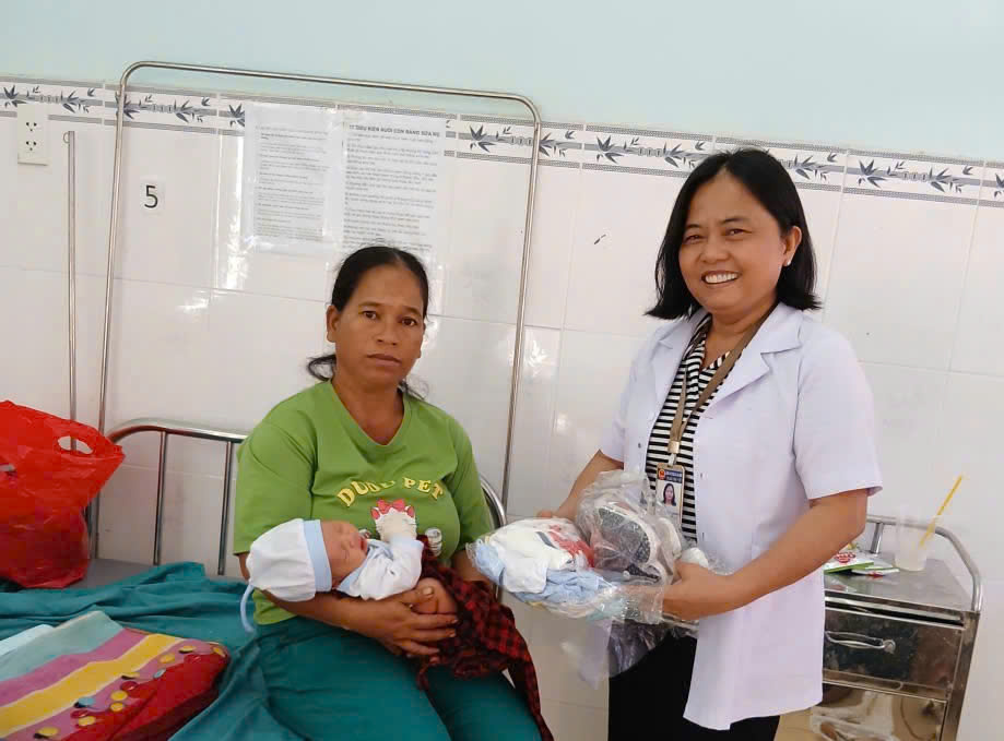 Bà Trần Thị Minh Trang, Trưởng khoa Sức khỏe sinh sản thăm hỏi, tặng quà mẹ con sản phụ tại trung tâm trong dịp Tết.