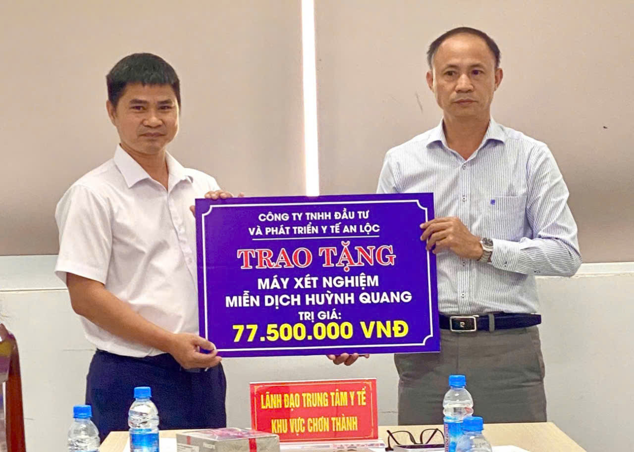 Vừa qua, Trung tâm Y tế khu vực (TTYTKV) Chơn Thành đã tổ chức lễ tiếp nhận máy xét nghiệm miễn dịch huỳnh quang trị giá 77,5 triệu đồng do Công ty TNHH Đầu tư và Phát triển Y tế An Lộc trao tặng.