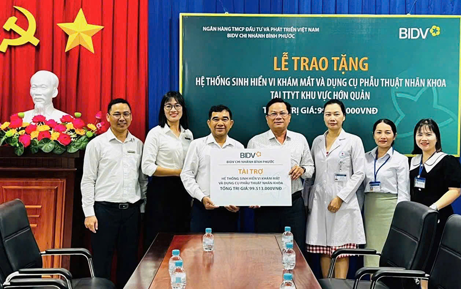 Vừa qua, Trung tâm Y tế khu vực (TTYT KV) Hớn Quản đã tiếp nhận hệ thống sinh hiển vi khám mắt và bộ dụng cụ phẫu thuật nhãn khoa hiện đại do Ngân hàng TMCP Đầu tư và Phát triển Việt Nam (BIDV) – chi nhánh Bình Phước tài trợ, với tổng giá trị 99.513.000 đồng.