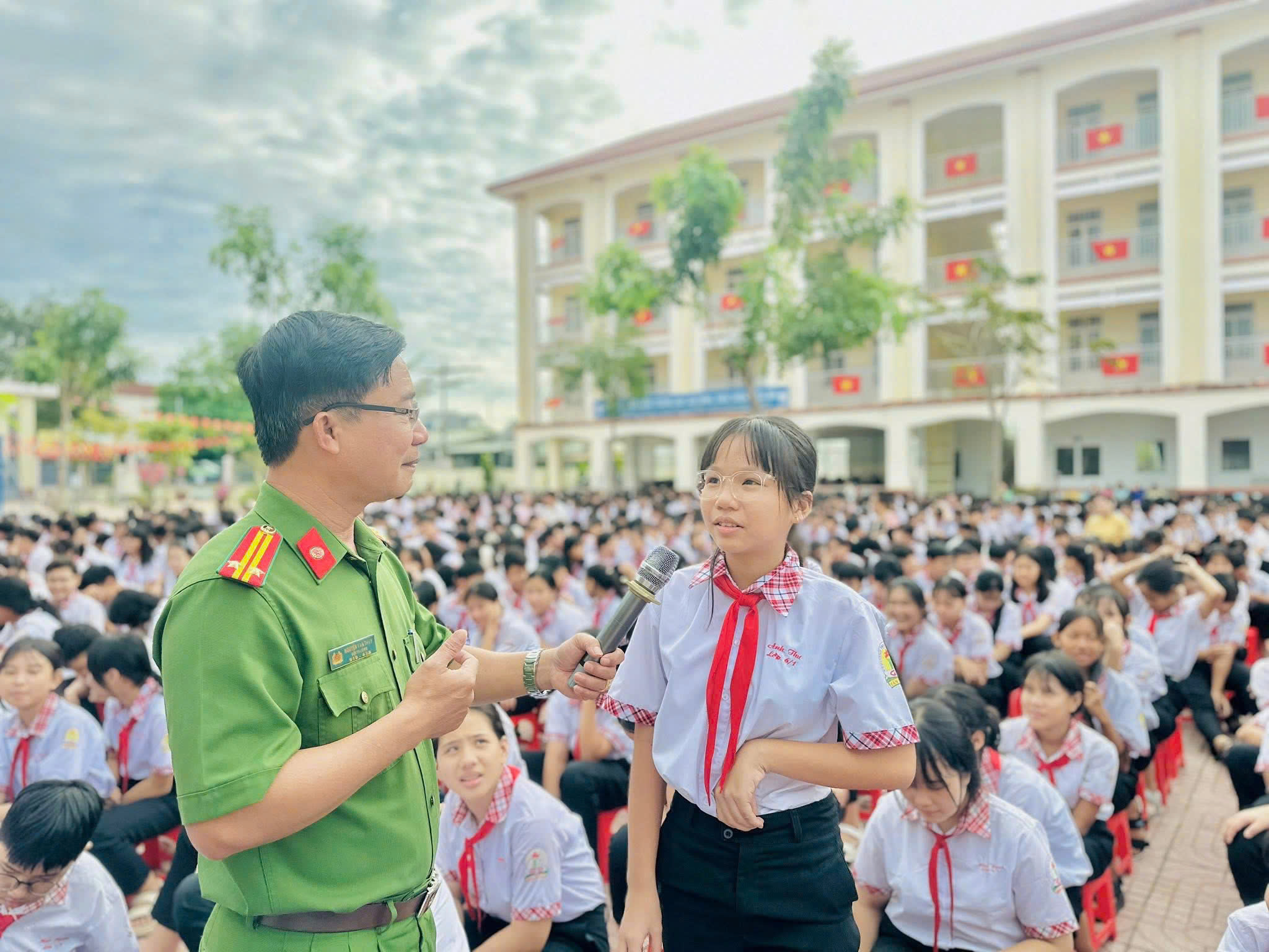 Học sinh Trường THCS Tân Xuân, phường Bình Phước trao đổi về phòng ngừa vi phạm pháp luật về an ninh mạng và phòng chống ma túy trong học đườngtại buổi tuyên truyền. (Ảnh CTV).