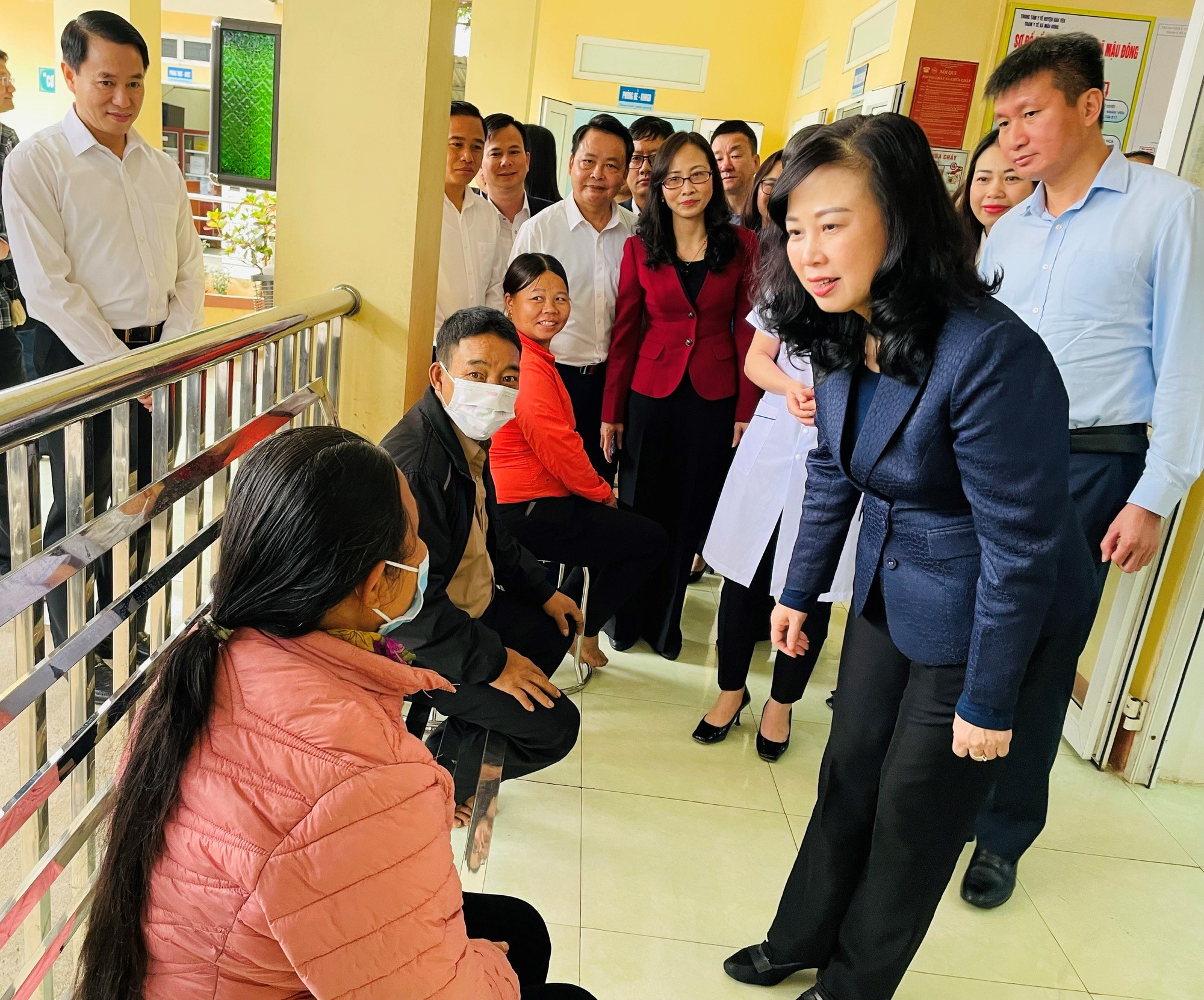 Bộ trưởng Bộ Y tế Đào Hồng Lan trò chuyện với người bệnh đến thăm khám tại Trạm Y tế xã Mậu Đông, tỉnh Lào Cai