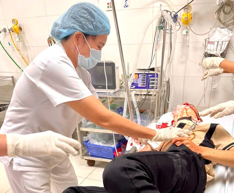 Điều dưỡng Vũ Thị Hảo, Khoa Cấp cứu Bệnh viện ĐK Bình Phước sơ cứu cho một bệnh nhân bị tai nạn giao thông.