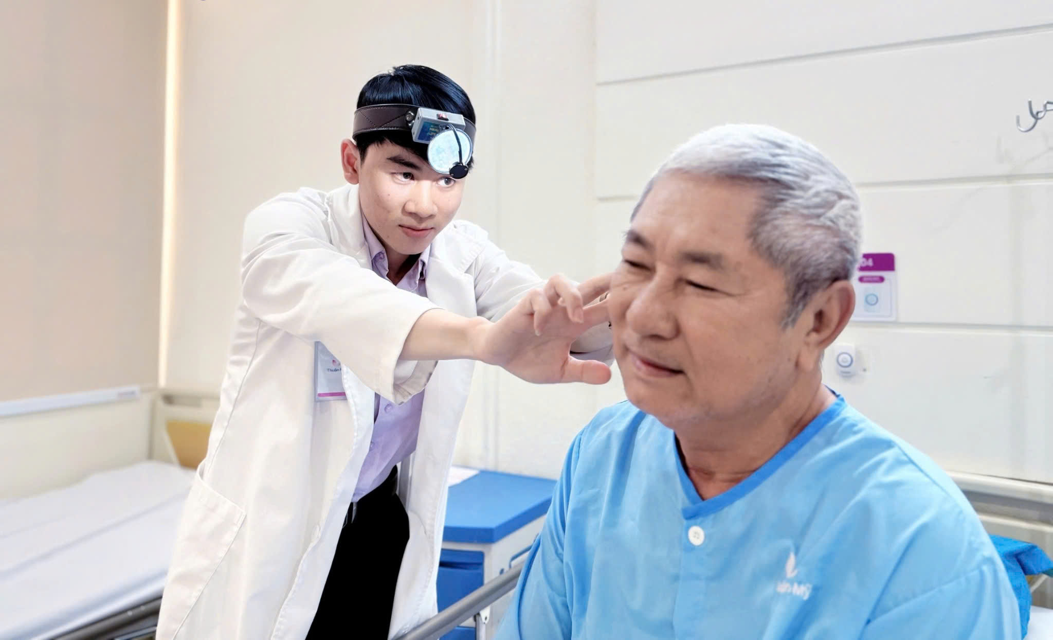 Bác sĩ khám tai cho bệnh nhân sau phẫu thuật.
