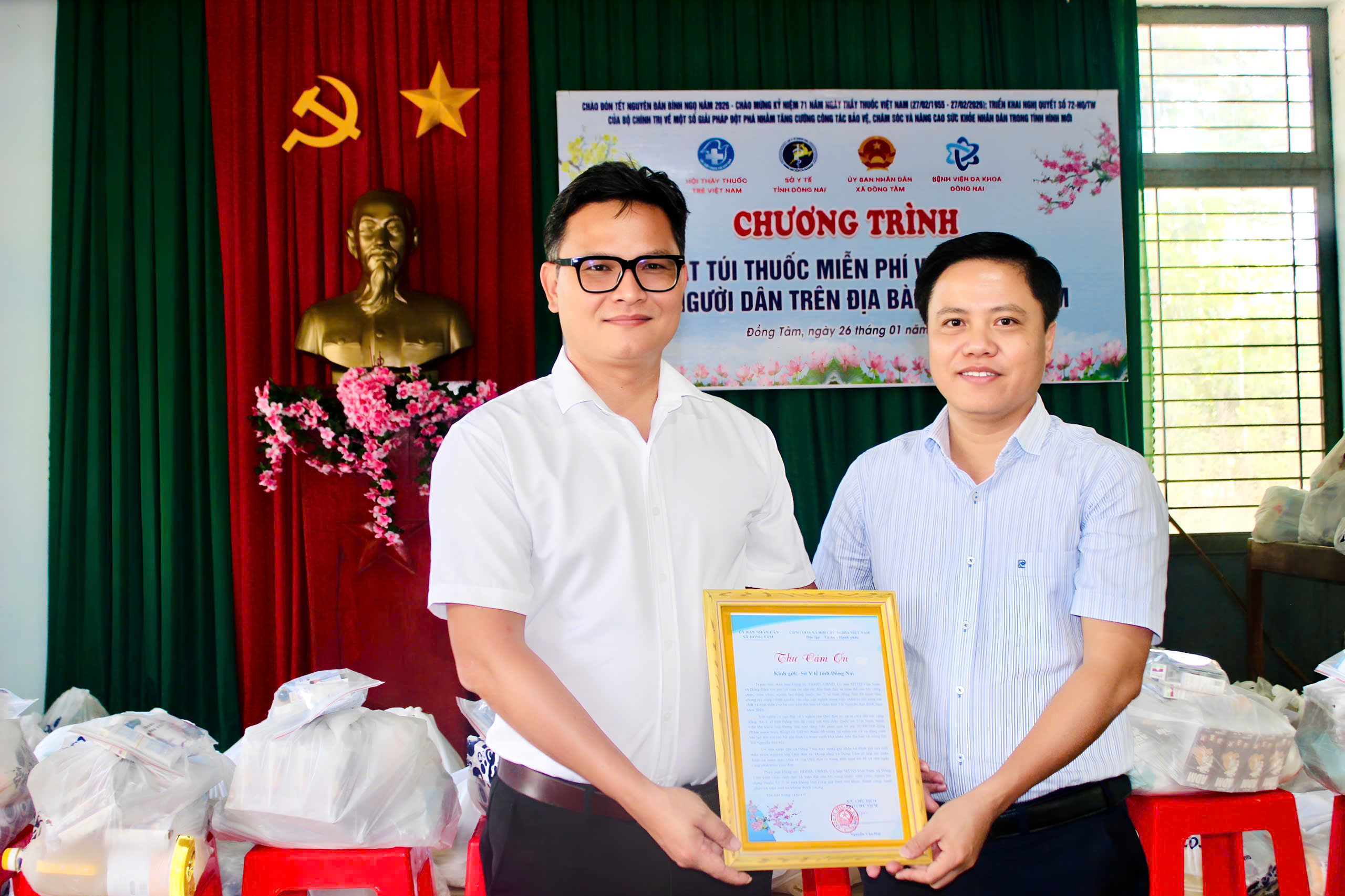 Nhân dịp Tết Nguyên đán Bính Ngọ 2026 và hướng tới kỷ niệm 71 năm Ngày Thầy thuốc Việt Nam (27-2-1955 - 27-2-2026), chiều 26-1, Hội Thầy thuốc trẻ Việt Nam, Sở Y tế Đồng Nai, Bệnh viện ĐK Đồng Nai phối hợp với UBND xã Đồng Tâm (tỉnh Đồng Nai) tổ chức chương trình Phát túi thuốc miễn phí và tặng quà Tết cho người dân trên địa bàn xã Đồng Tâm.