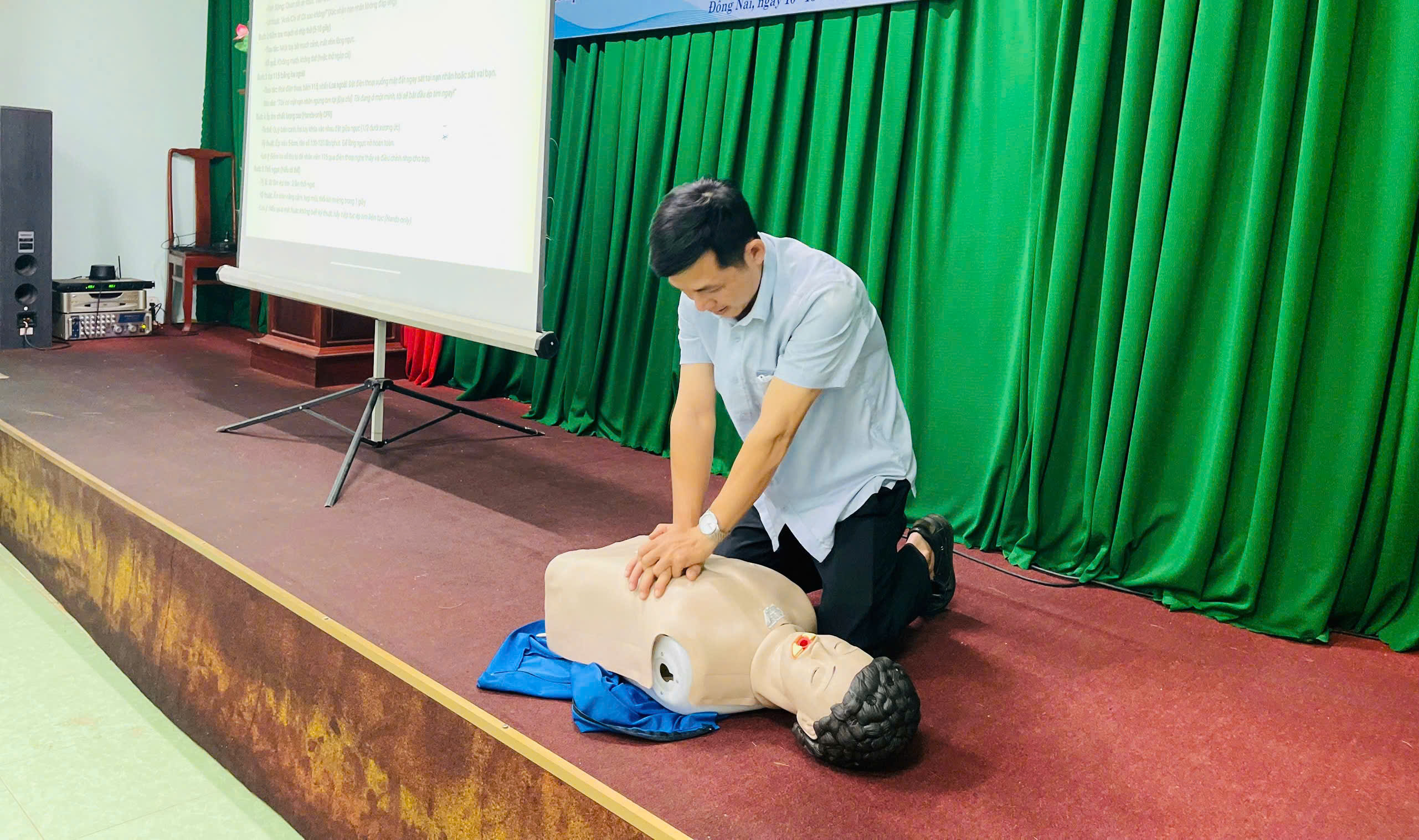 Học viên thực hành diễn tập ép tim ngoài lồng ngực tại lớp tập huấn.
