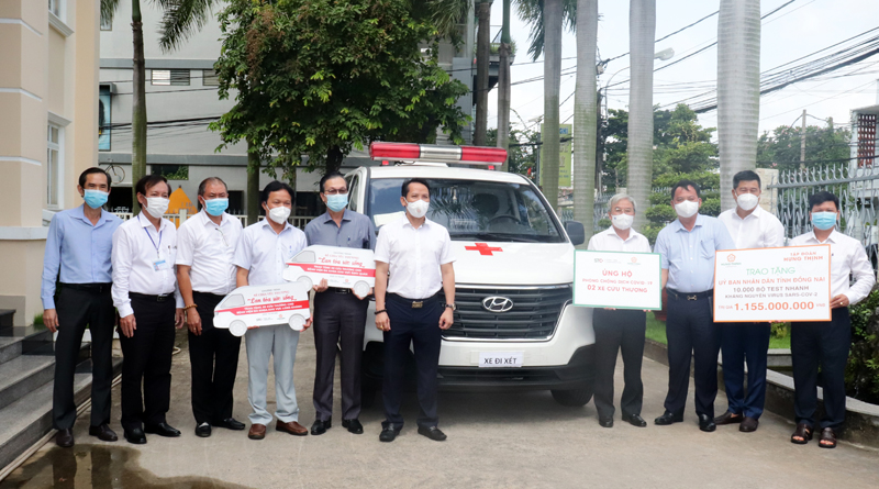 Tại buổi lễ, đại diện Tập đoàn Hưng Thịnh- Sông Tiên đã trao tặng bảng tượng trưng 2 xe ô tô cứu thương trị giá 1,580 tỷ đồng và 10 ngàn bộ kit test nhanh COVID-19 trị giá trên 1,1 tỷ đồng. Trong đó hai xe được trao tặng hai bệnh viện: ĐKKV Long Khánh và Định Quán và 10 ngàn bộ kit test nhanh được trao cho Sở Y tế để hỗ trợ phòng, chống dịch COVID-19 .