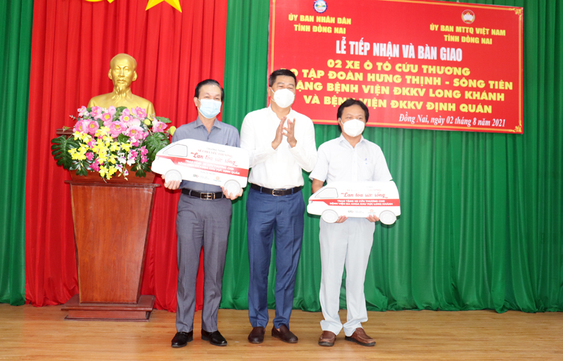 Sáng nay 2-8, UBND tỉnh, Ủy ban MTTQ Việt Nam tỉnh đã tổ chức lễ tiếp nhận 2 xe ô tô cứu thương do Tập đoàn Hưng Thịnh - Sông Tiên trao tặng Bệnh viện ĐKKV Long Khánh, Bệnh viện ĐKKV Định Quán và một số trang bị y tế hỗ trợ phòng, chống dịch COVID-19. Dự buổi lễ có các đồng chí: Võ Tấn Đức, Phó chủ tịch UBND tỉnh và Chủ tịch Ủy ban MTTQ Việt Nam tỉnh Cao Văn Quang cùng lãnh đạo thường trực MTTQ Việt Nam tỉnh, đại diện nhà tài trợ và lãnh đạo 2 bệnh viện.