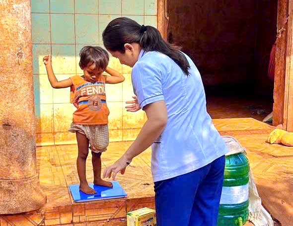 Nhân viên y tế theo dõi cân nặng cho trẻ tại hộ gia đình.
