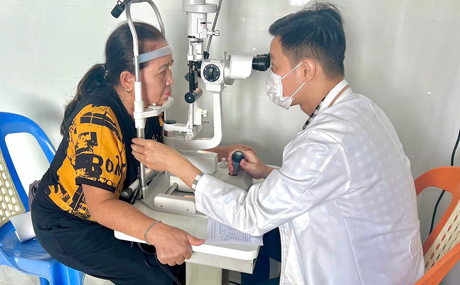 Bác sĩ khám mắt cho một NCT trên địa bàn khu vực Bù Đăng.