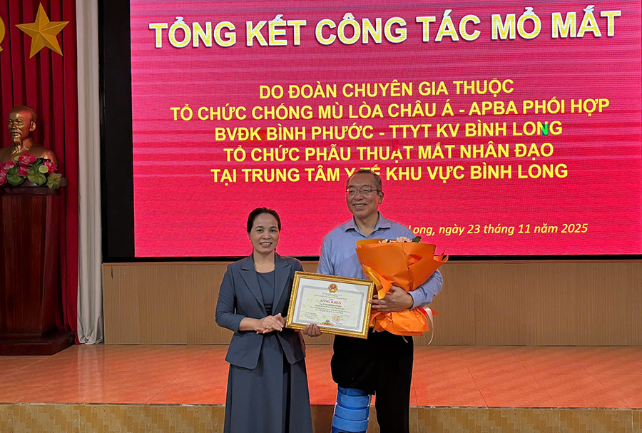 Dịp này, TTƯT.BS.CKII Đỗ Thị Nguyên, Giám đốc Sở Y tế trao bằng khen của UBND tỉnh Bình Phước (cũ) cho APBA và GS.BS Hattori Tadashi, vì những đóng góp trong chương trình mổ mắt miễn phí cho bệnh nhân nghèo trên địa bàn tỉnh. Ngân hàng Nam Á Bank trao tặng 120 phần quà cho các bệnh nhân được phẫu thuật và người có hoàn cảnh khó khăn.