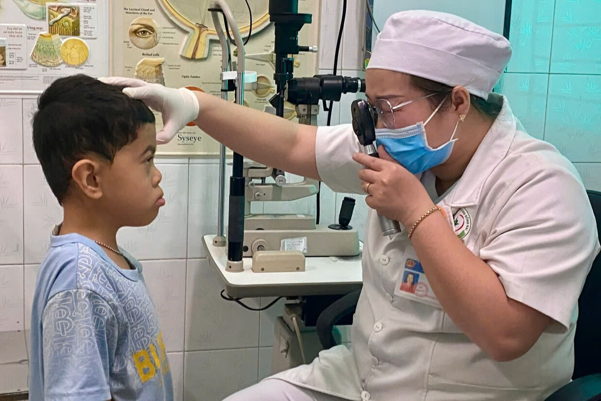 Nhân viên y tế đo khúc xạ cho bé Vũ Trung kiên.