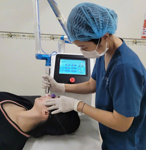 Bác sĩ chiếu tia Plasma lạnh điều trị da cho một bệnh nhân.