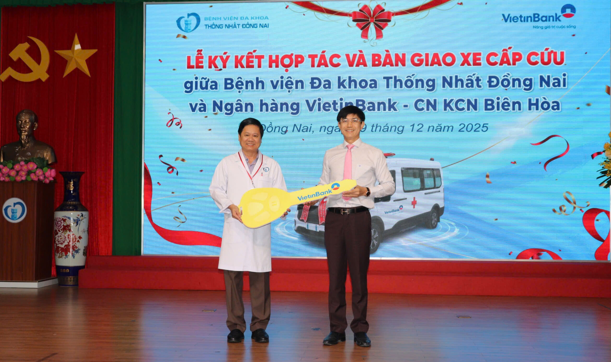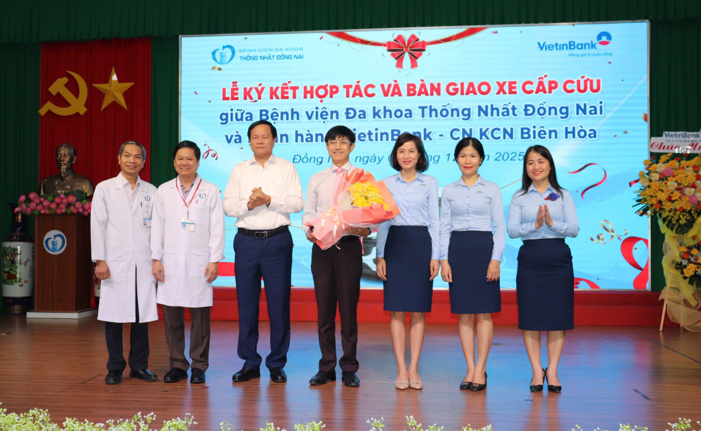 Sáng 9-12, Bệnh viện Đa khoa (ĐK) Thống Nhất Đồng Nai phối hợp với Ngân hàng VietinBank – Chi nhánh Khu công nghiệp Biên Hòa tổ chức lễ ký kết hợp tác và bàn giao xe cấp cứu trị giá gần 1,1 tỷ đồng. Tham dự buổi lễ có BS.CKII Nguyễn Văn Bình - Phó Giám đốc Sở Y tế; ông Nguyễn Đức Trịnh - Giám đốc VietinBank KCN Biên Hòa; BS.CKII Nguyễn Tường Quang - Giám đốc Bệnh viện ĐK Thống Nhất Đồng Nai cùng lãnh đạo, cán bộ của hai đơn vị.