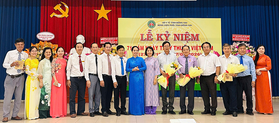 TTƯT. BS CKII Đỗ Thị Nguyên Giám đốc Sở Y tế Đồng Nai chụp hình lưu niệm với các thầy thuốc Bệnh viện Phổi Đồng Nai nhân kỷ niệm 71 năm Ngày Thầy thuốc Việt Nam.