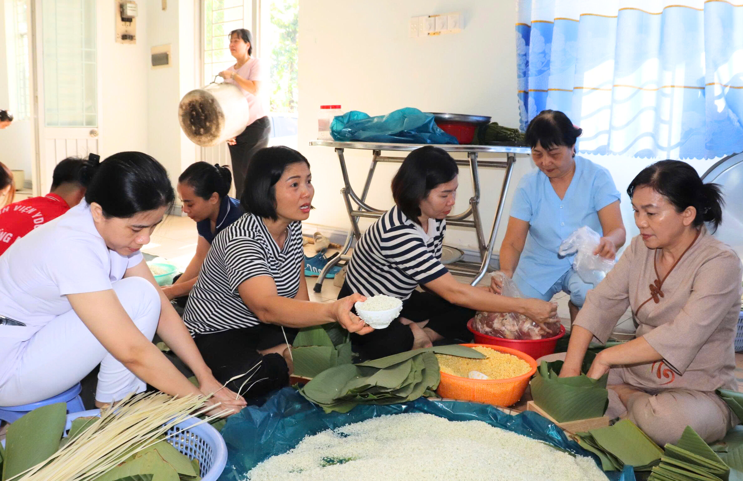 Nhân viên của bệnh viện gói bánh chưng chuẩn bị trao tặng cho người bệnh.