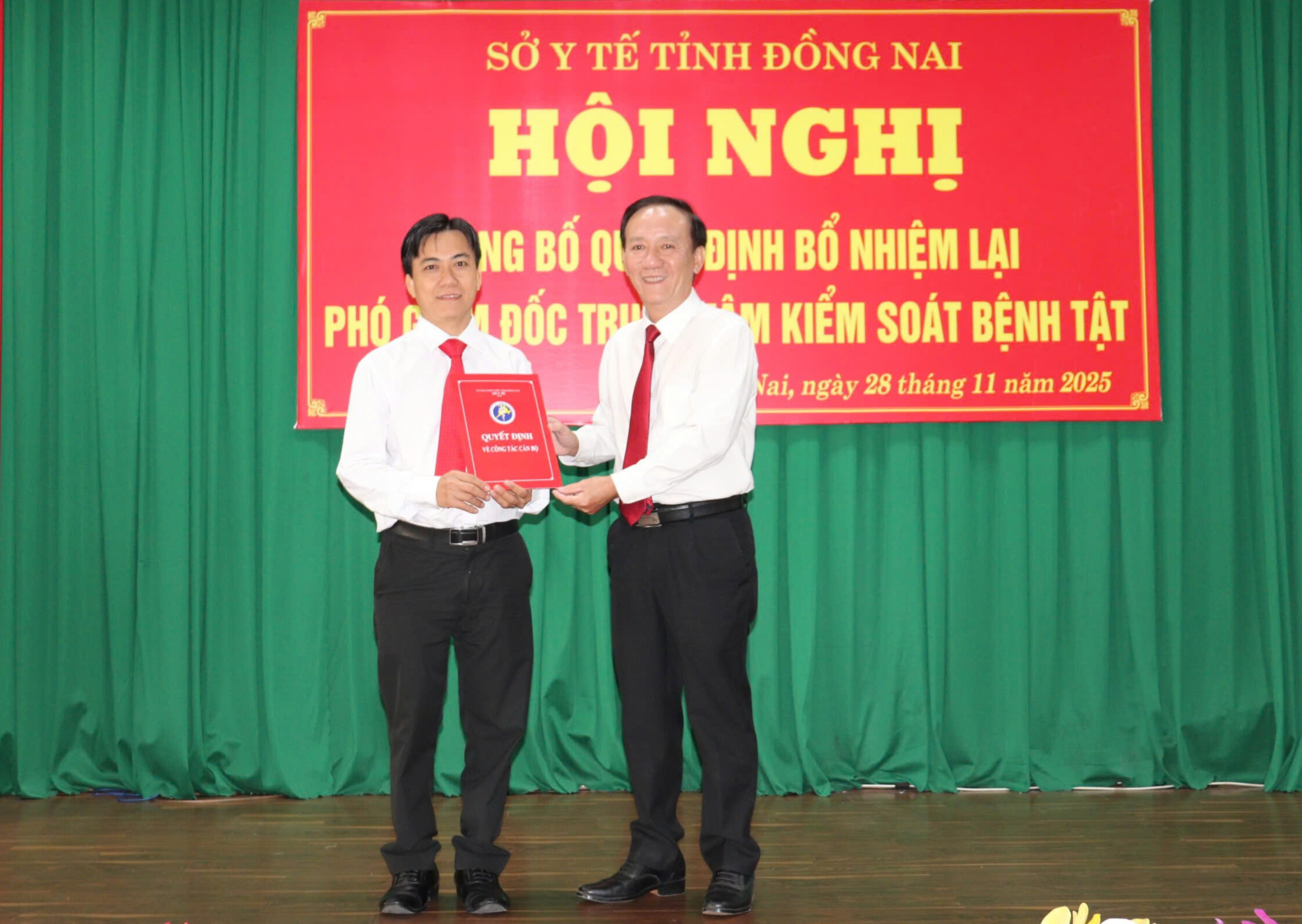Sáng ngày 28-11, BS.CKII Lưu Văn Dũng, Phó Giám đốc Sở Y tế đã trao quyết định bổ nhiệm lại chức danh Phó Giám đốc Trung tâm Kiểm soát bệnh tật tỉnh Đồng Nai (CDC Đồng Nai) cho ThS Trần Ngọc Quang. Thời hạn bổ nhiệm 5 năm, kể từ ngày 1 tháng 12 năm 2025.
