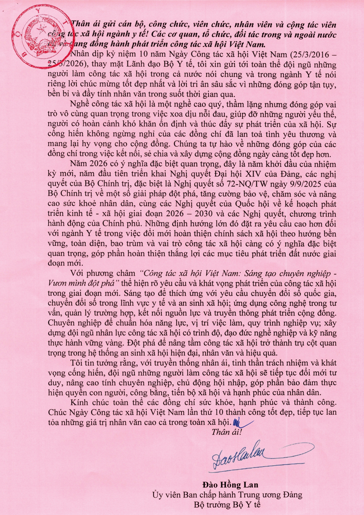 Nhân dịp kỷ niệm 10 năm Ngày Công tác xã hội Việt Nam (25/3/2016 25/3/2026), Bộ trưởng Bộ Y tế Đào Hồng Lan đã gửi thư chúc mừng gửi cán bộ, công chức, viên chức, nhân viên và cộng tác viên công tác xã hội cả nước; Các cơ quan, tổ chức, đối tác trong và ngoài nước và đang đồng hành phát triển công tác xã hội Việt Nam.