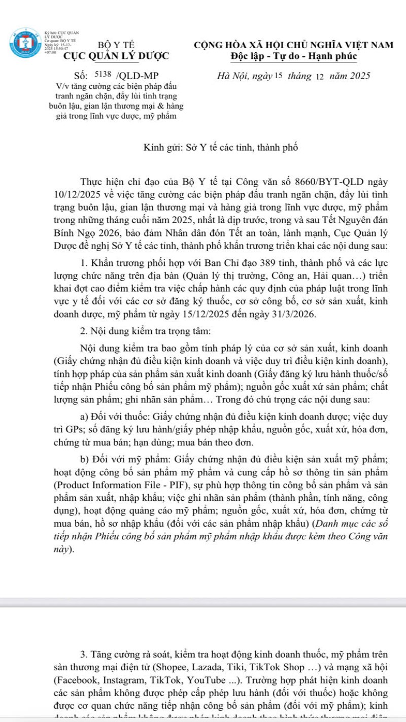 Thực hiện chỉ đạo của Bộ Y tế tại Công văn số 8660/BYT-QLD ngày 10/12/2025 về việc tăng cường các biện pháp đấu tranh ngăn chặn, đẩy lùi tình trạng buôn lậu, gian lận thương mại và hàng giả trong lĩnh vực dược, mỹ phẩm trong những tháng cuối năm 2025, nhất là dịp trước, trong và sau Tết Nguyên đán Bính Ngọ 2026 bảo đảm nhân dân đón Tết an toàn, lành mạnh, Cục Quản lý Dược đã đề nghị Sở Y tế các tỉnh, thành phố khẩn trương phối hợp với Ban Chỉ đạo 389 tỉnh, thành phố và các lực lượng chức năng trên địa bàn triển khai đợt cao điểm kiểm tra việc chấp hành các quy định của pháp luật trong lĩnh vực y tế đối với các cơ sở đăng ký thuốc, cơ sở công bố, cơ sở sản xuất, kinh doanh dược, mỹ phẩm (15/12/2025 - 31/3/2026).