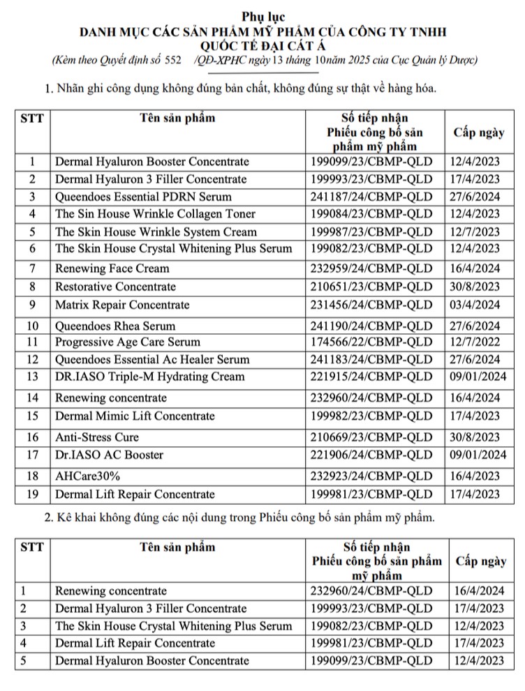 Theo Cục Quản lý Dược (Bộ Y tế), Công ty TNHH quốc tế Đại Cát Á thực hiện hành vi vi phạm hành chính về mỹ phẩm như: