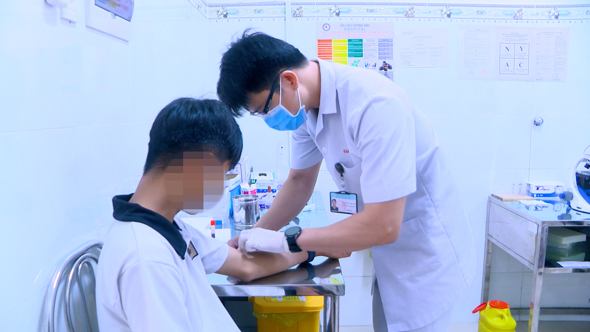 Bệnh nhân được lấy mẫu máu xét nghiệm tìm dị nguyên tại Bệnh viện Da liễu Đồng Nai.