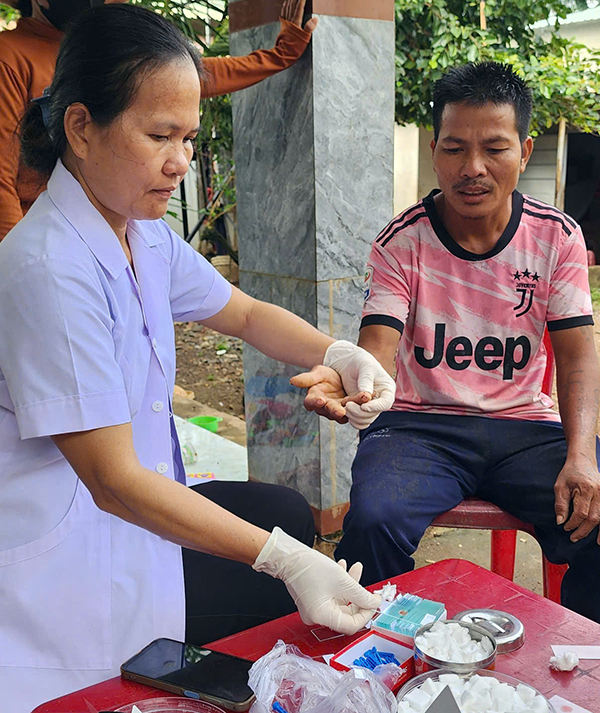 Nhân viên y tế Khoa Ký sinh trùng – Côn trùng lấy lam máu xét nghiệm sốt rét tại ấp Vẻ Vang, xã Lộc Quang.