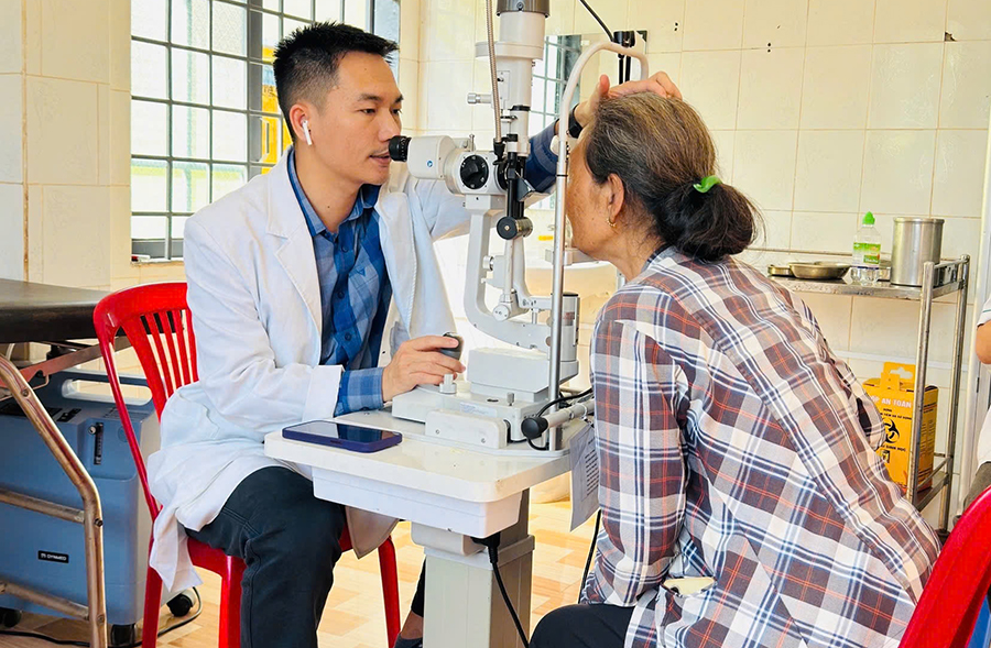 Bác sĩ khám mắt cho một người dân trên địa bàn xã Lộc Quang.