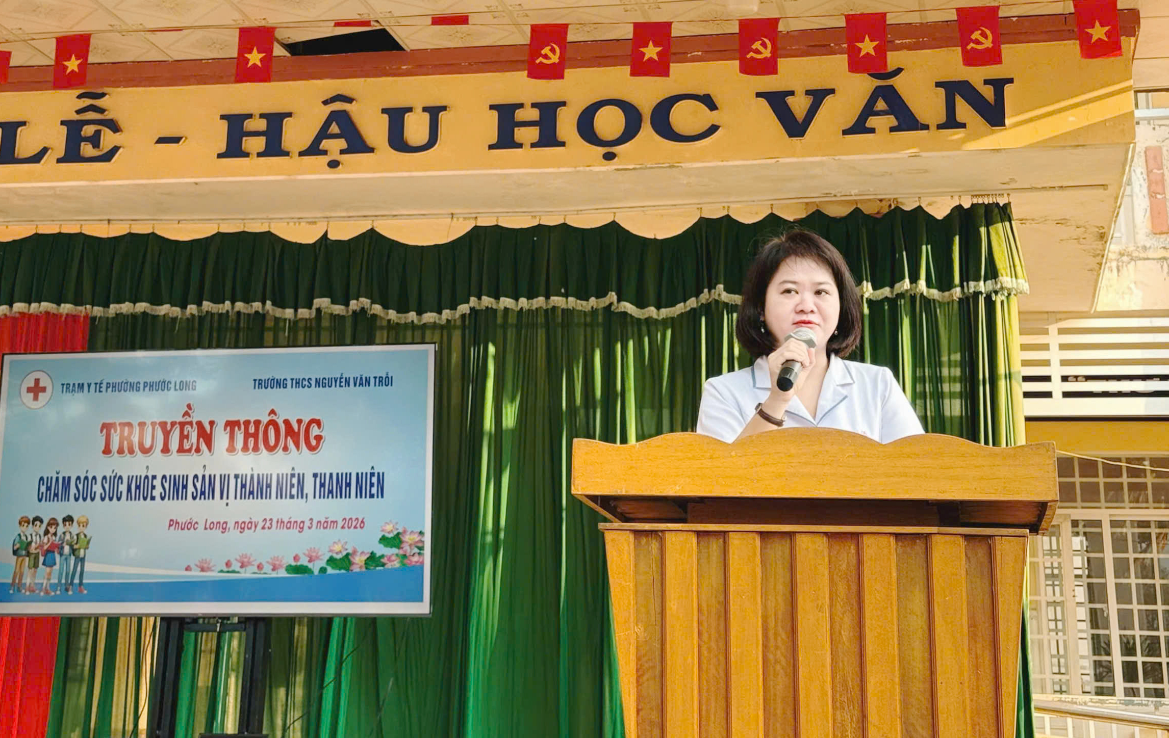 Sáng 23-3, Trạm Y tế phường Phước Long phối hợp với Trường THCS Nguyễn Văn Trỗi tổ chức buổi truyền thông về chăm sóc sức khỏe sinh sản vị thành niên, thanh niên cho hơn 800 học sinh khối 6, 7, 8 và 9.