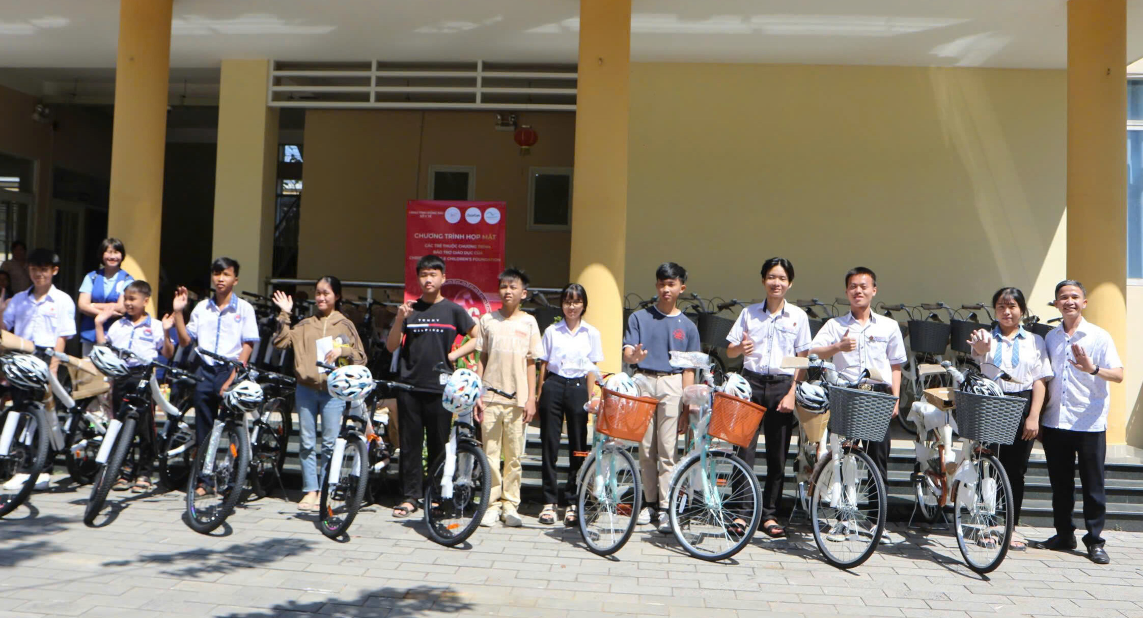 Các em học sinh được trao tặng xe đạp để đến trường.