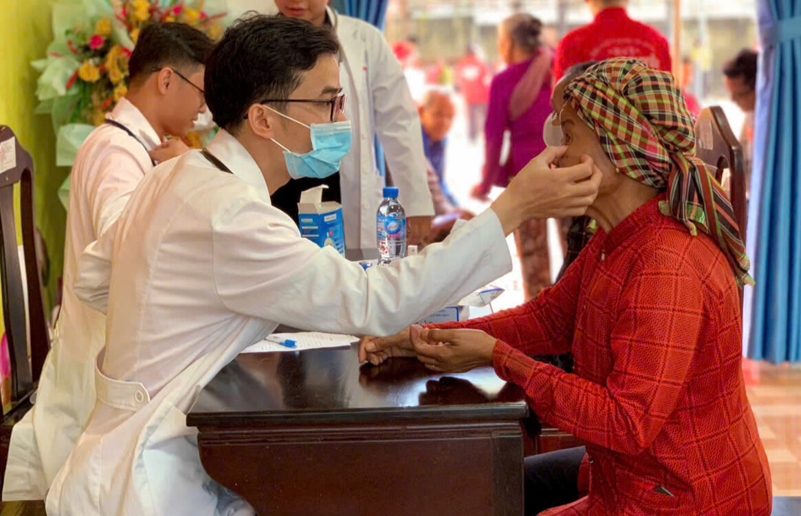 Bác sĩ khám mắt cho một người dân trên địa bàn xã Lộc Quang.