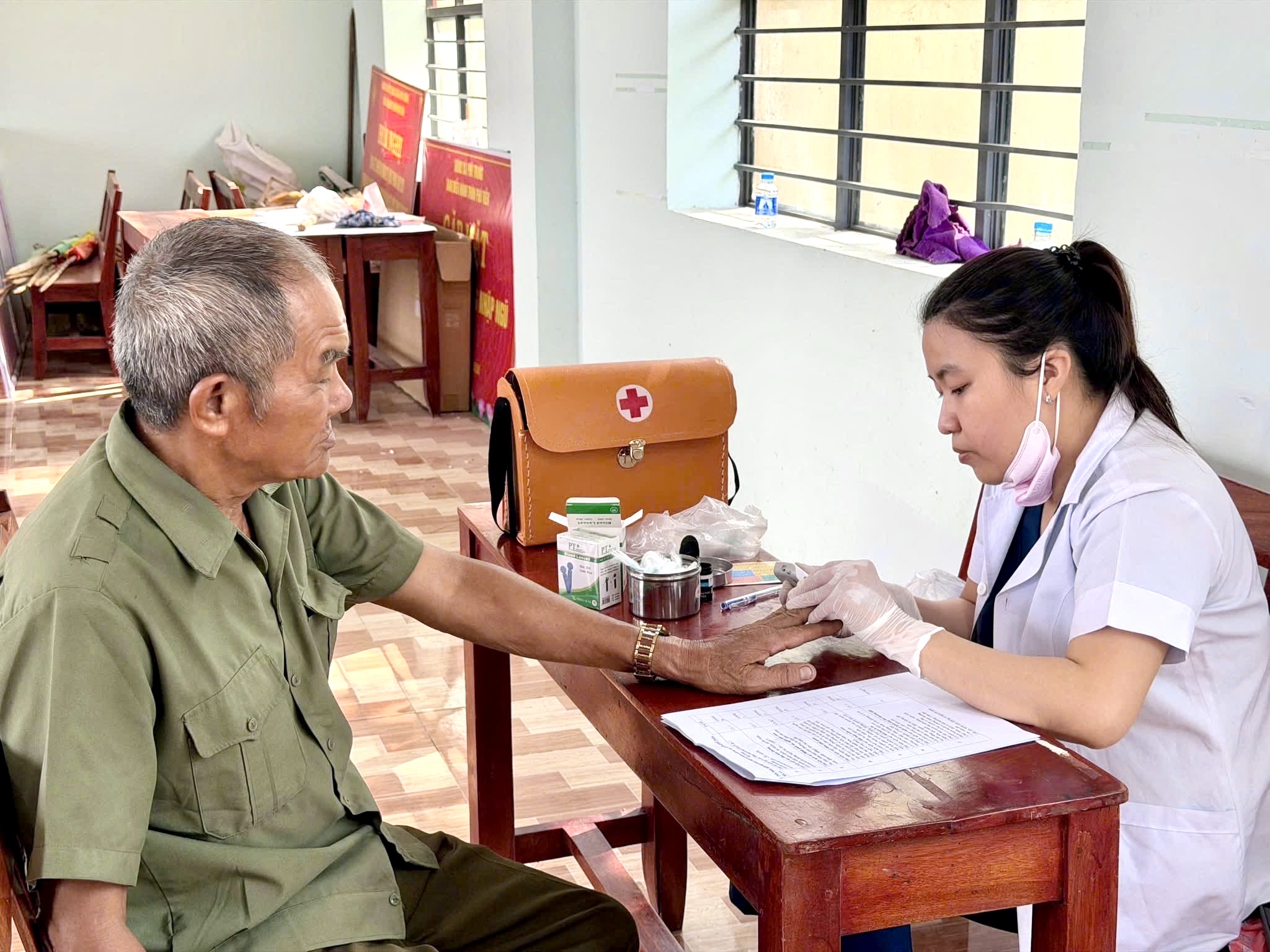 Nhân viên y tế kiểm tra đường huyết cho người dân.
