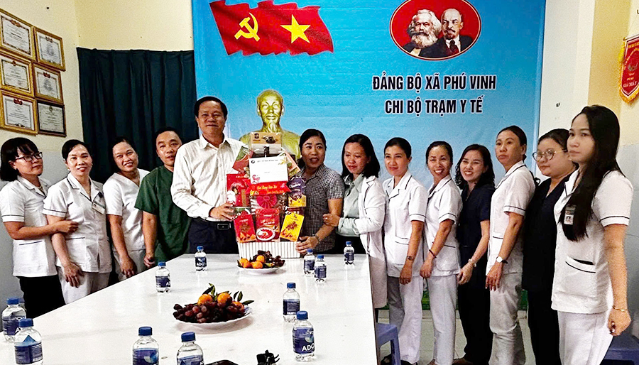 Lãnh đạo Sở Y tế thăm, tặng quà và động viên đội ngũ y, bác sĩ tại Trạm Y tế xã Phú Vinh.