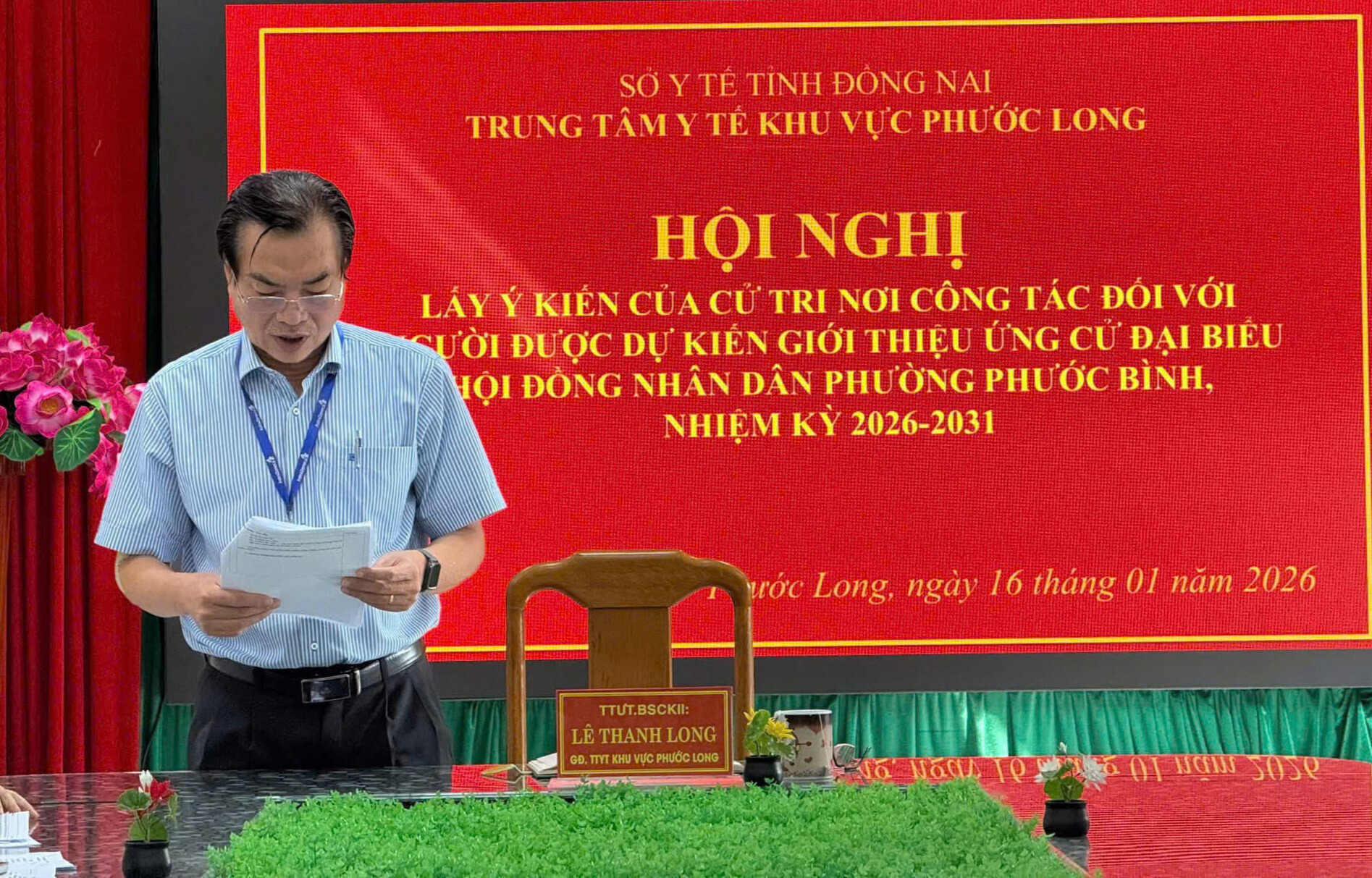 Vừa qua, BS.CKII Lê Thanh Long – Bí thư Đảng bộ bộ phận, Giám đốc Trung tâm Y tế khu vực (TTYTKV) Phước Long đã chủ trì hội nghị lấy ý kiến cử tri nơi công tác đối với người được dự kiến giới thiệu ứng cử đại biểu Hội đồng nhân dân (HĐND) phường Phước Bình, tỉnh Đồng Nai, nhiệm kỳ 2026–2031.