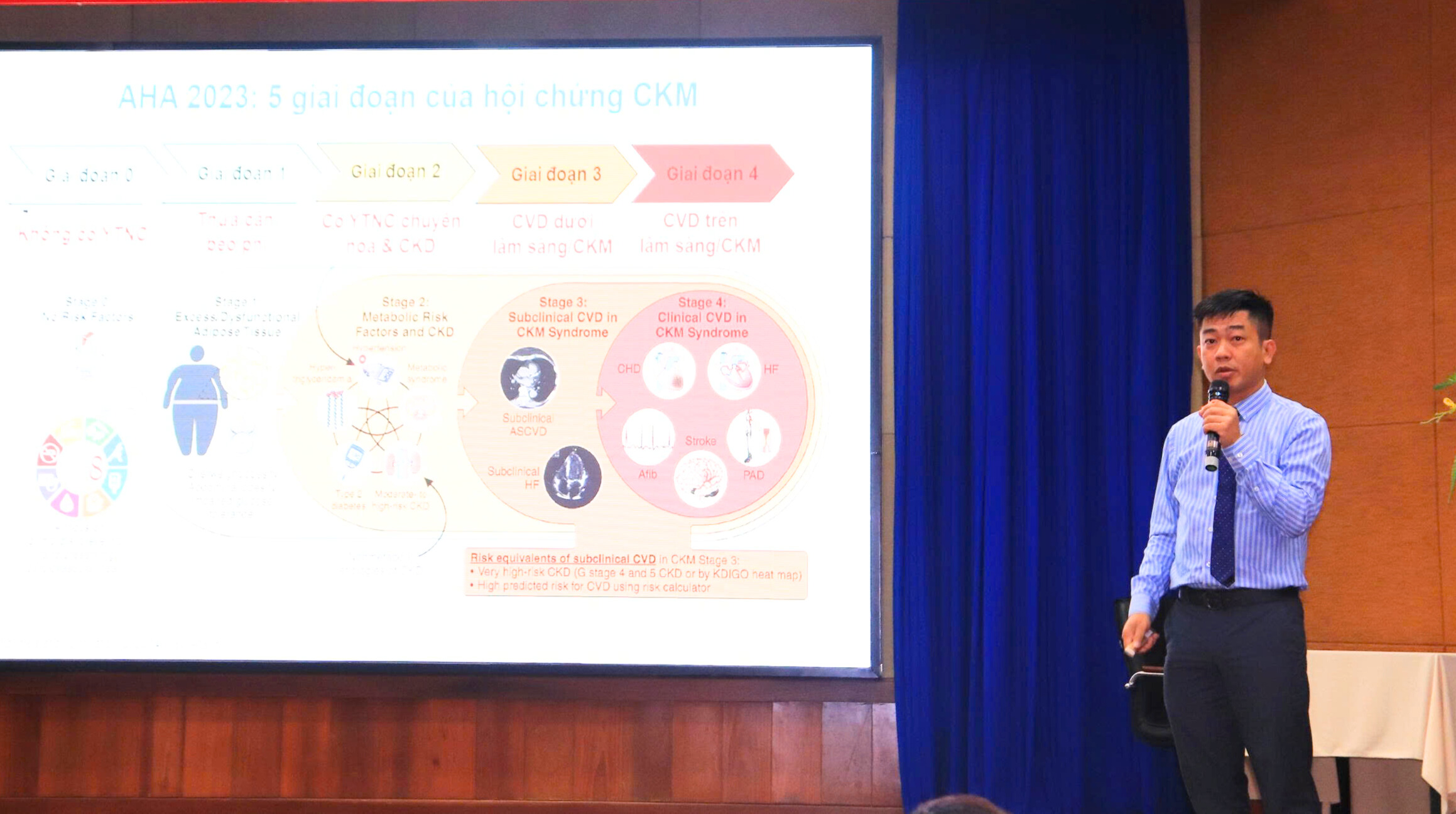 BS.CKII Trần Quang Khánh, khoa Tim mạch can thiệp, Bệnh viện Chợ Rẫy, TP. Hồ Chí Minh chia sẻ chuyên đề Bảo vệ sớm Tim mạch – thận – chuyển hóa, ứng dụng y học chứng cứ vào thực hành lâm sàng tại hội thảo.