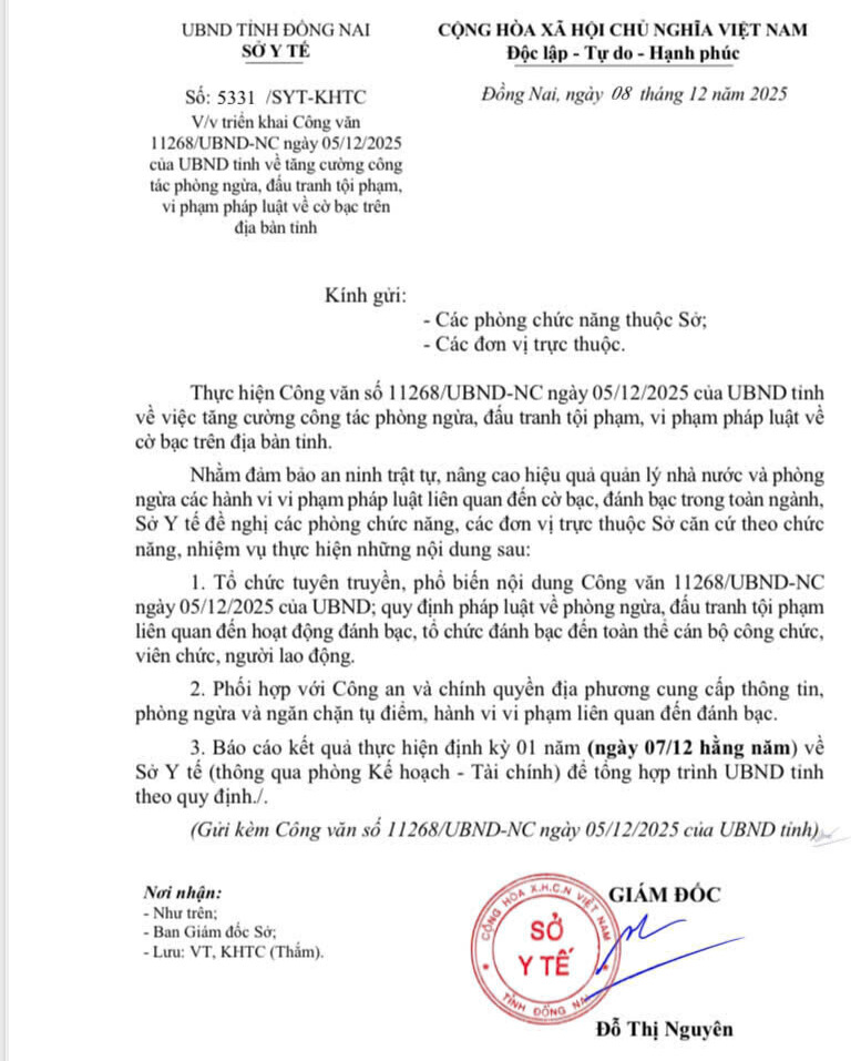 Sở Y tế tỉnh Đồng Nai vừa có văn bản chỉ đạo các đơn vị trực thuộc tăng cường công tác phòng ngừa và đấu tranh với các hành vi vi phạm pháp luật liên quan đến cờ bạc, đánh bạc trong toàn ngành, nhằm triển khai nghiêm túc Công văn số 11268/UBND-NC của UBND tỉnh.