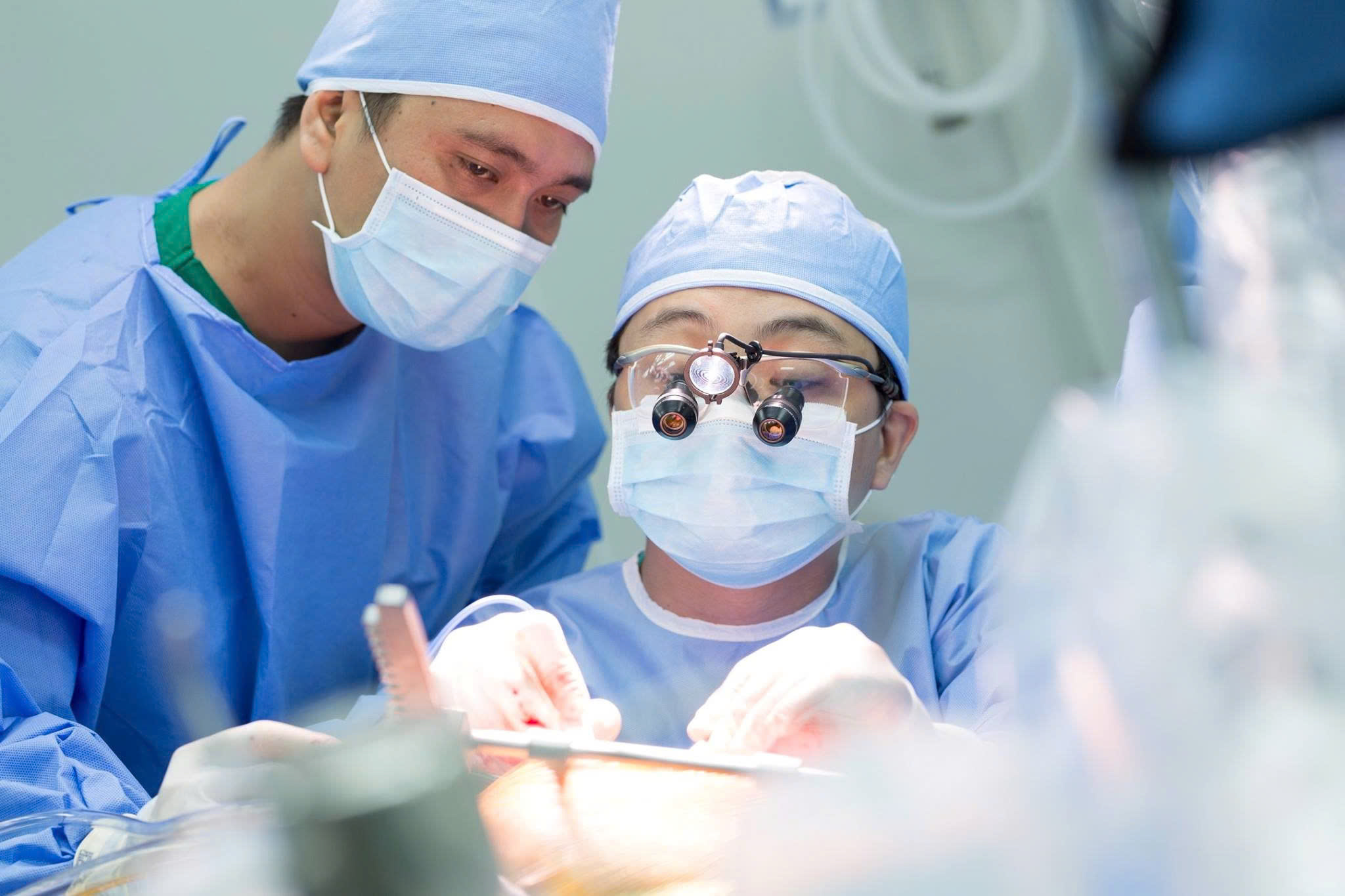 TS-BS Võ Tuấn Anh (ngồi) cùng đồng nghiệp thực hiện một ca phẫu thuật tim khó