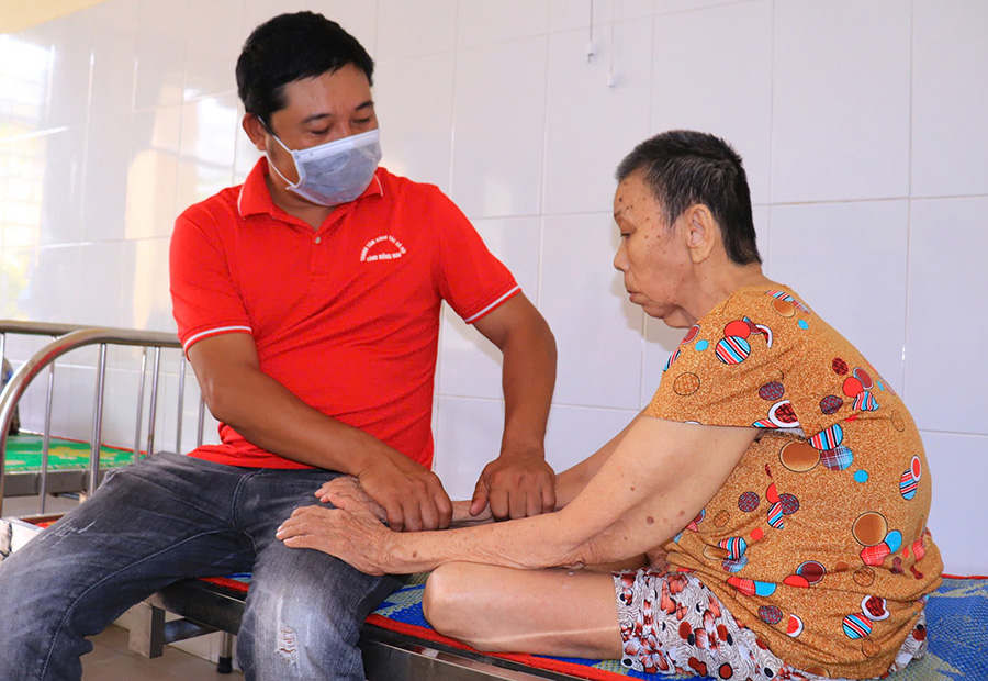 Anh Hoàng Văn Đức xoa bóp tay cho các cụ.