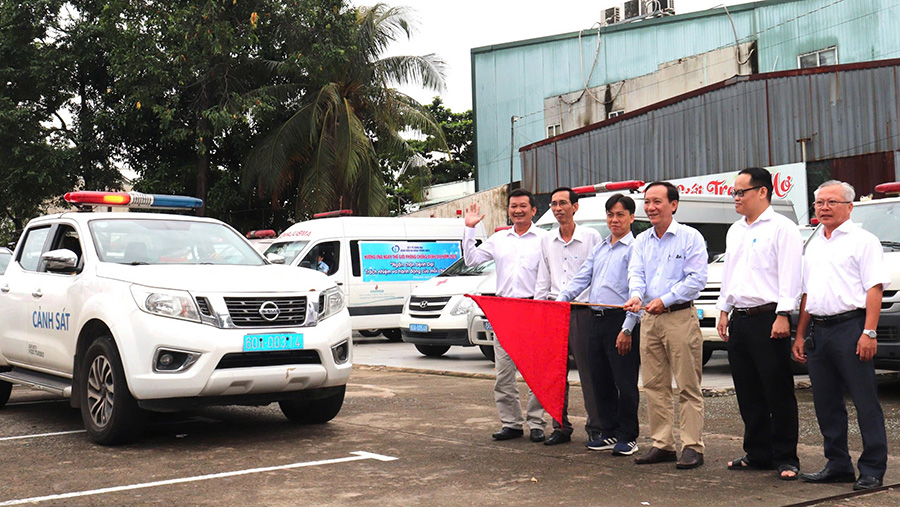 Lãnh đạo Sở Y tế và đại diện các sở, ngành, TTYT phất cờ xuất phát cho đoàn xe diễu hành.