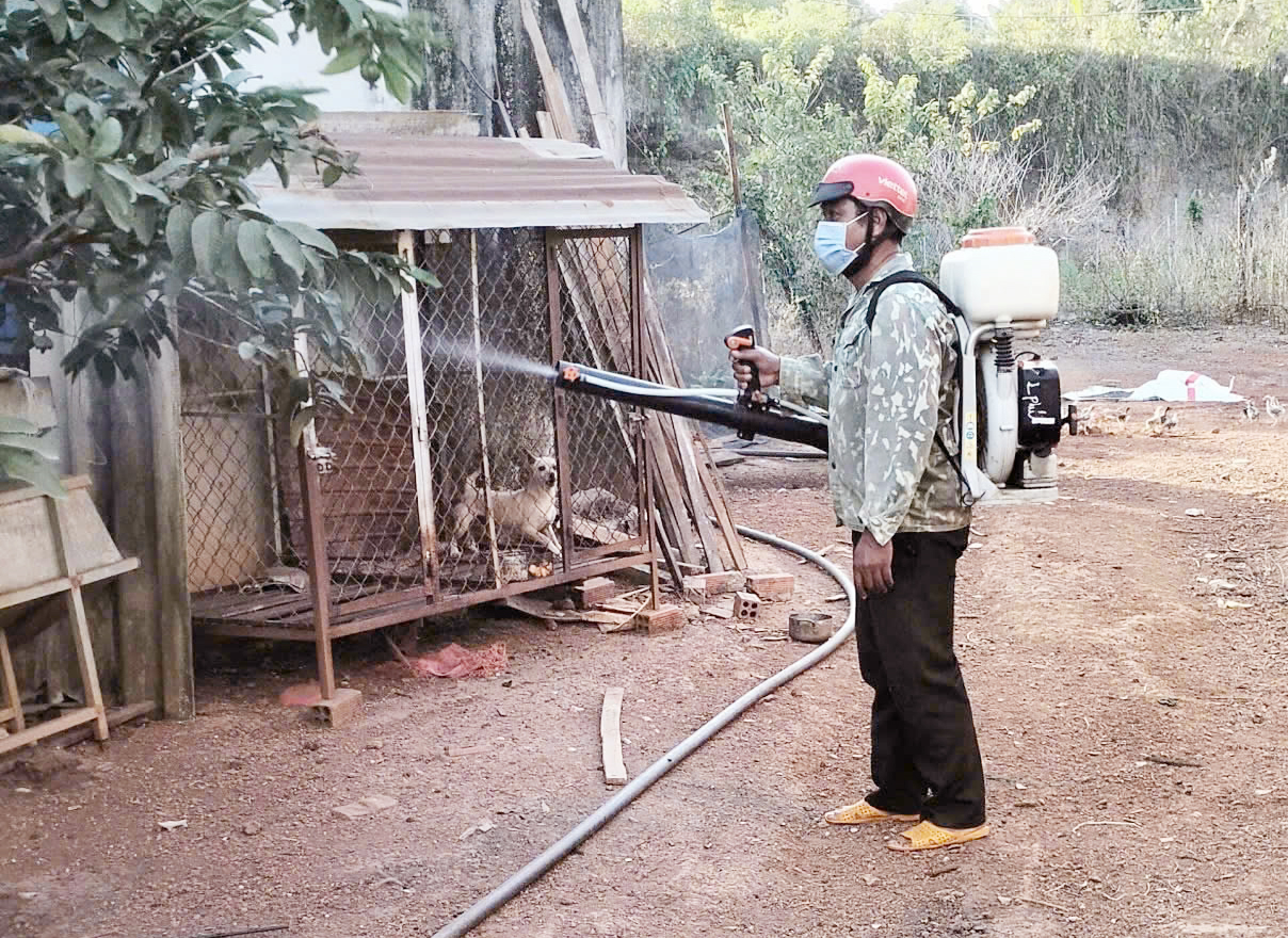Nhân viên y tế phun hóa chất phòng, chống bệnh sốt xuất huyết cho người dân trên địa bàn xã Lộc Quang.