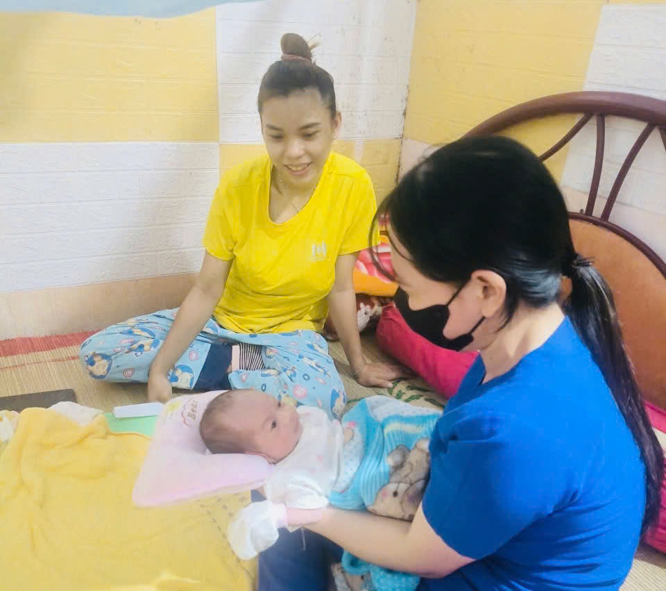Điều dưỡng Nguyễn Thị Nga thăm hỏi và hướng dẫn cách chăm sóc trẻ sơ sinh tại một hộ gia đình.